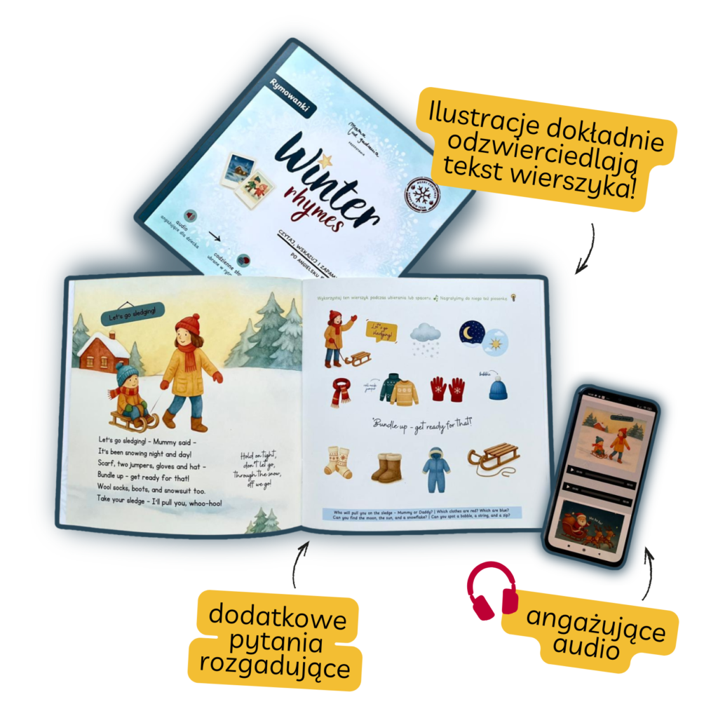 To nic, że nie rozumiesz całego tekstu! Czytasz rymowankę i pokazujesz paluszkiem obrazek za obrazkiem… „Scarf, two jumpers, gloves and hat… Bundle up! Get ready for that!”